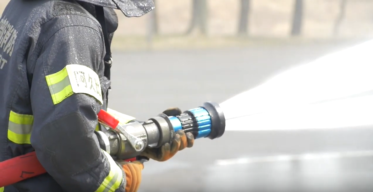 しかし、龍神ノズルは広角放水が可能で、火煙が噴出する面積に合わせて消火することができます。