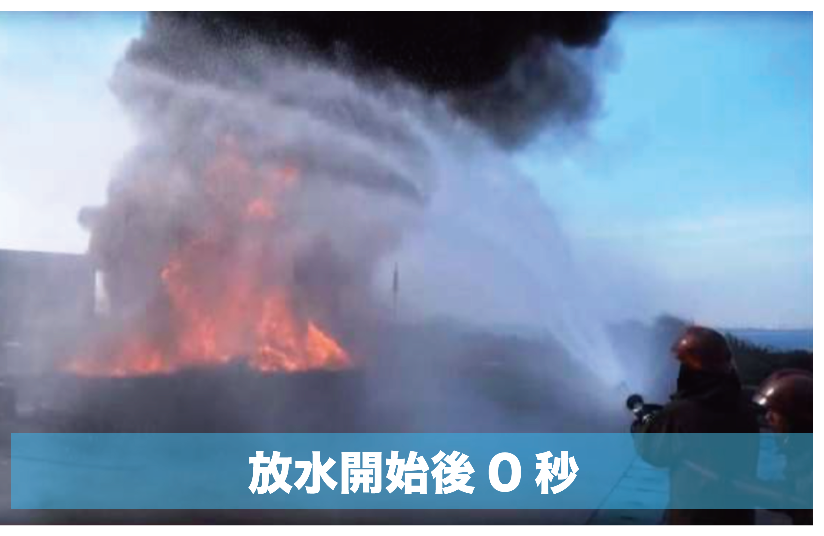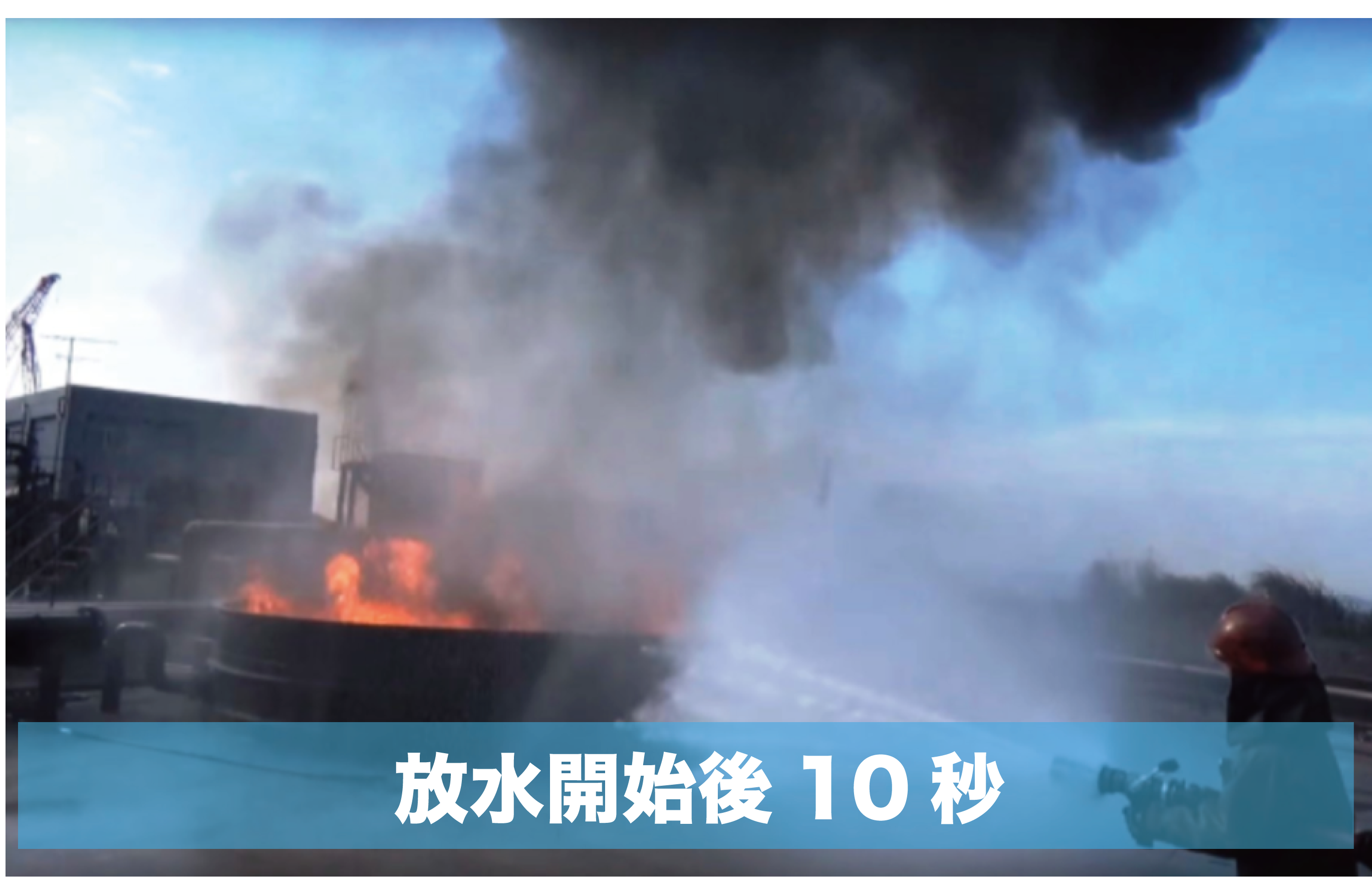 粒状の放水は、延焼部を「叩き消す」作用を生み、強力な消火力を実現します。