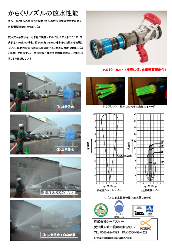 | 放水パターン | 先端ノズル部 | 棒状放水 / 広角放水(16度) 広角長距離 中実放水 15~20m |